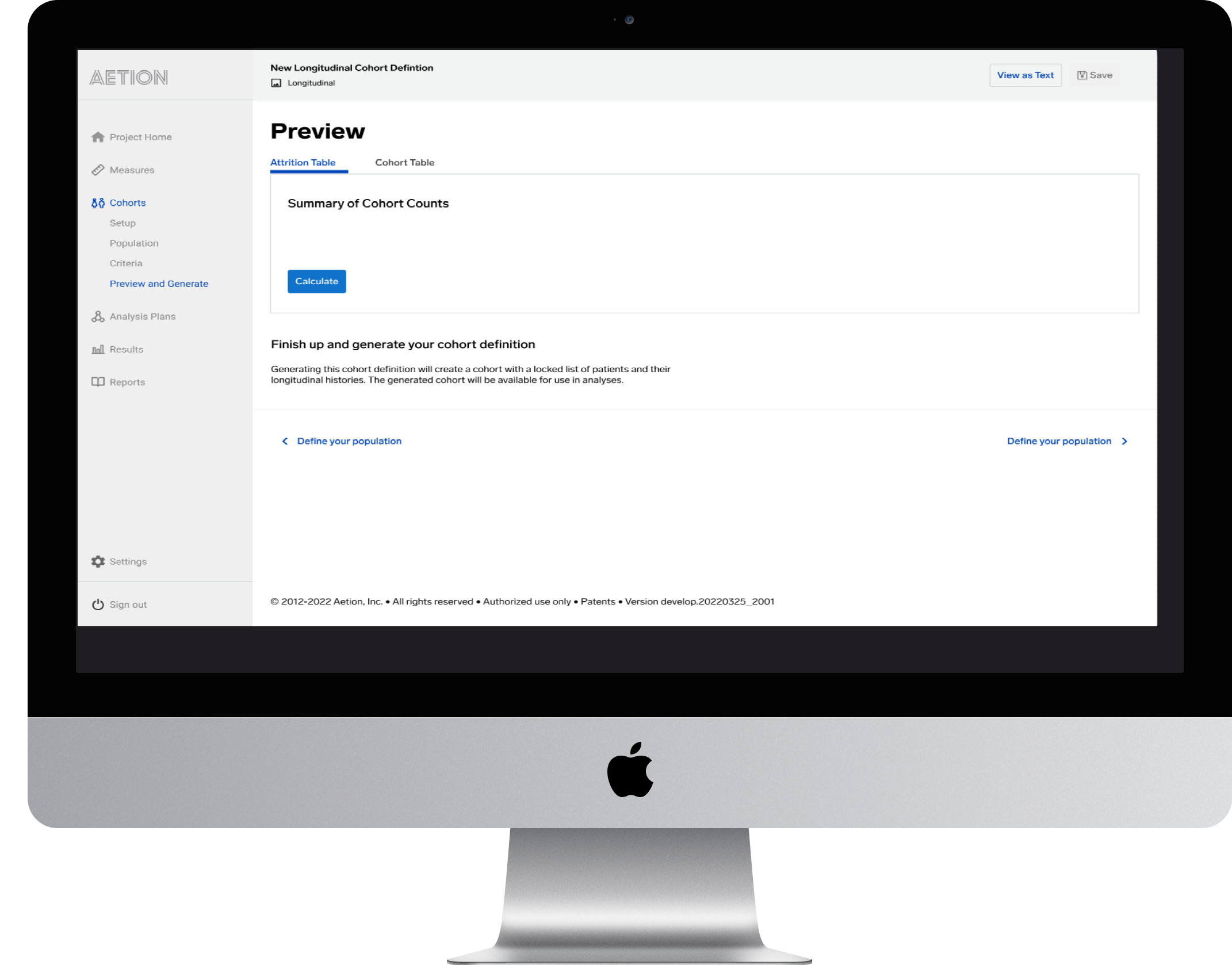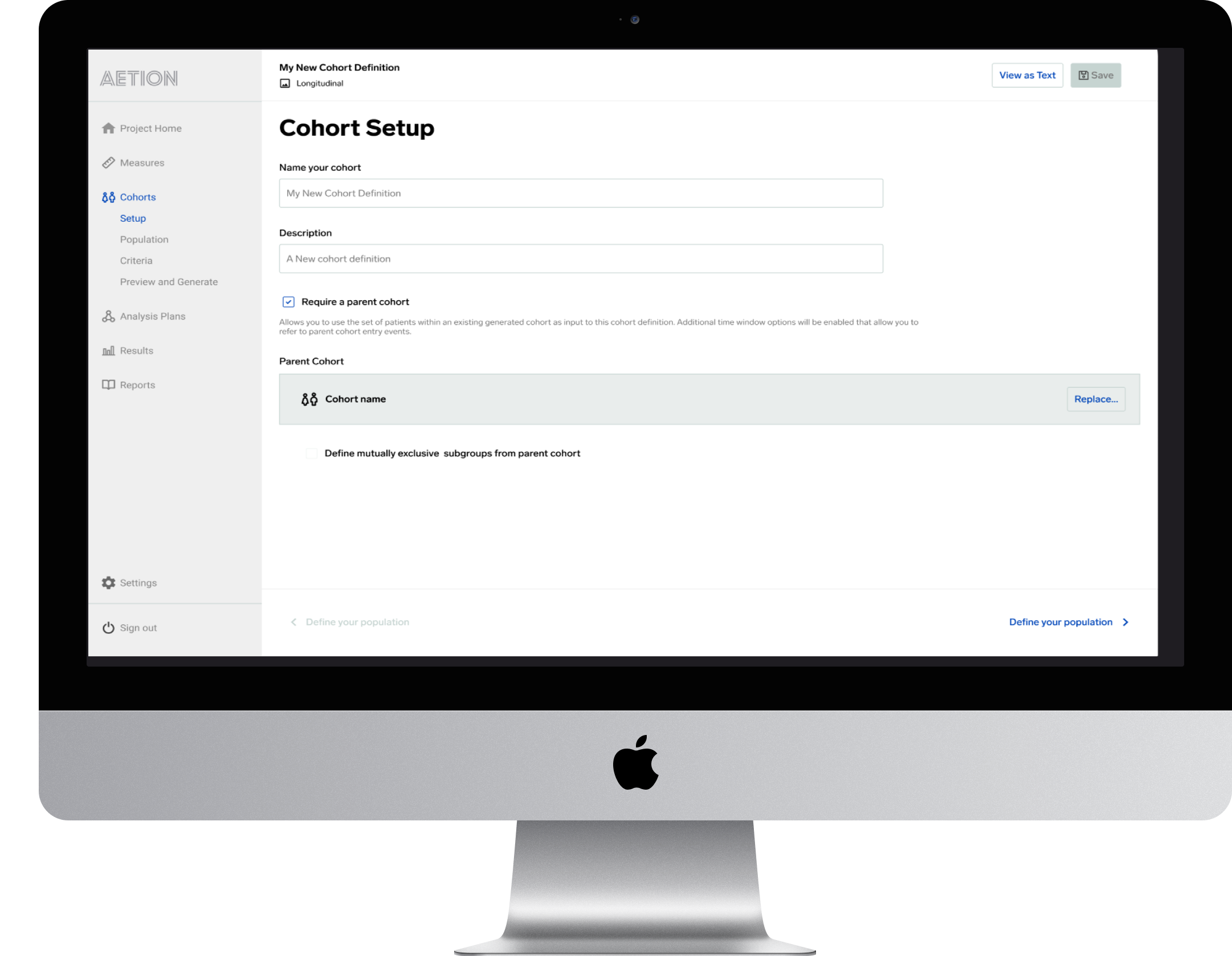 The Aetion platform in its current state of cohort definition used a sidebar to guide the user through the series of steps as they defined their population. We found through our conversations that the users would get through a few steps (choose the cohort type, choose the dataset, name the cohort, select a parent cohort, etc.), and realize that as they were making some of these decisions that they would be locked into a ‘siloed’ flow, one where there was no return. So, if they decided that they made a mistake, or changed their mind early on, there was no way to back out without starting over.