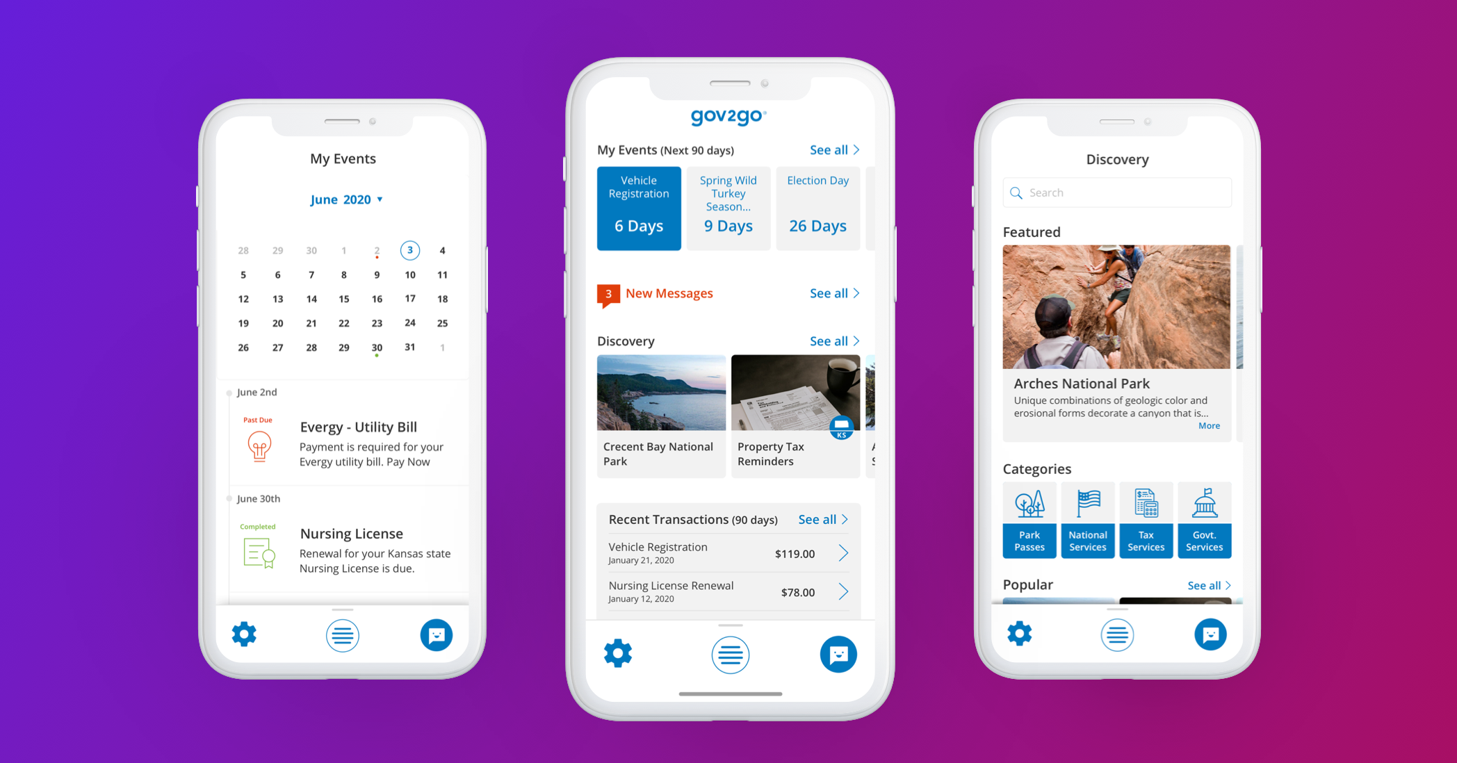 V.1 Gov2Go screens for Timeline, My Services, and Settings